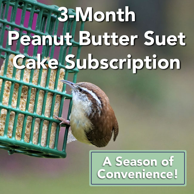 Note: This suet subscription provides 12 C&S Peanut Butter Delight No Melt Suet Dough Cakes, 11.75 oz. each, for 3 consecutive months and does not auto-renew. The suet cakes are individually packed for easy handling.