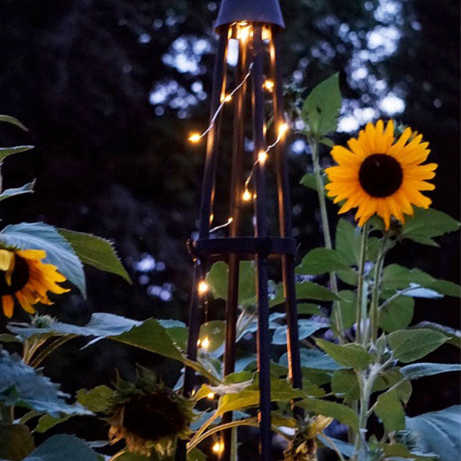 Vertically adorn your landscaping and support two plants with these Achla Graphite Garden Obelisks.  Using obelisks within your flowerbed brings geometric flair to it, while creating a striking support for vines or climbing plants.  Four upright, metal rods create each of these frames, completed by three rings with progressively smaller diameters.  Three dimensional leaf figures on the legs keep these flat, metal rings in place, while a point on the base of each leg inserts into soil easily.  Cross bars at the top and base of each piece provide stability, and a cap and top orb complete the structures.              Place these obelisks in your landscaping above climbing plants, and weave tendrils around the rails to foster a healthy root system.  The pair looks great flanking a walkway or garden entry, or acting as endcaps for a garden bed.  A graphite colored, powder coated finish on each meshes with the outdoors, and their metal construction adds durability.  Stylishly support two plants with these Graphite Garden Obelisks.  Some assembly required.