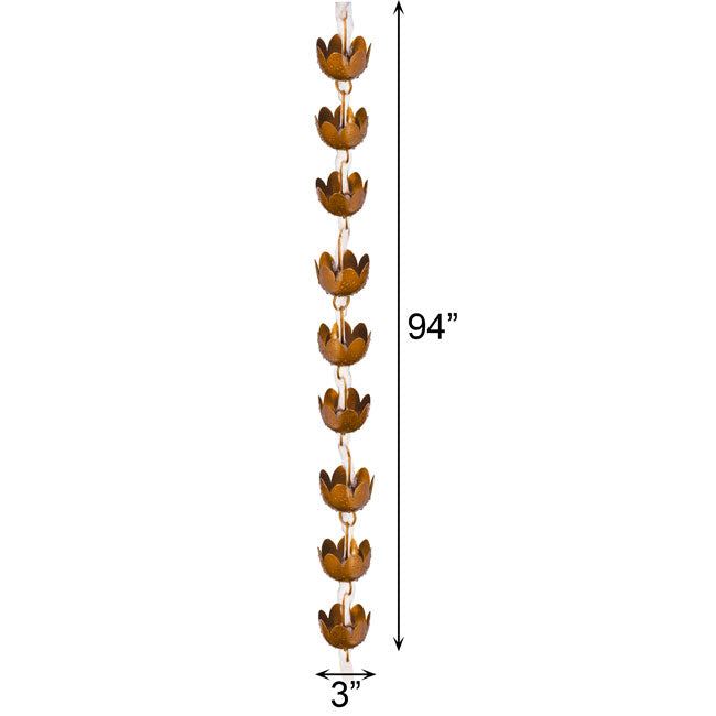 Turn each corner of your home into a decorative showcase with these Ancient Graffiti Lily Rain Chains. Attaching rain chains, rather than downspouts, to the end of each gutter brings a unique look to your home, while adding the wonderful sounds of gently flowing water to the area. Open lily flower figures create the cups on these robust, steel chains, and the browned copper tone of each piece offers a natural touch to your home. Scalloped edges on each cup enhance the floral theme, the rounded sides and open bases helping direct water down the chains. For the ultimate in water conservation, place a barrel or basin beneath each chain to collect rainwater for use in your garden. Each unit has a steel clip that slips securely into your gutter outlet, making it simple to replace your downspout, and the approximate 94" length of each chain is great for many homes. The flower cup and chain sections on each unit are removable, for truly customized sizing, and their steel construction remains durable for seasons of use. Add a floral hint to your house in an exciting new way with these Lily Rain Chains.