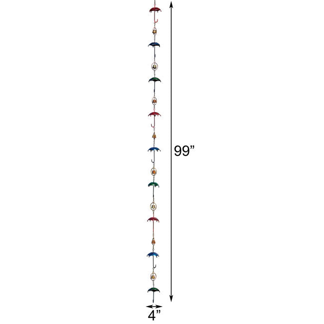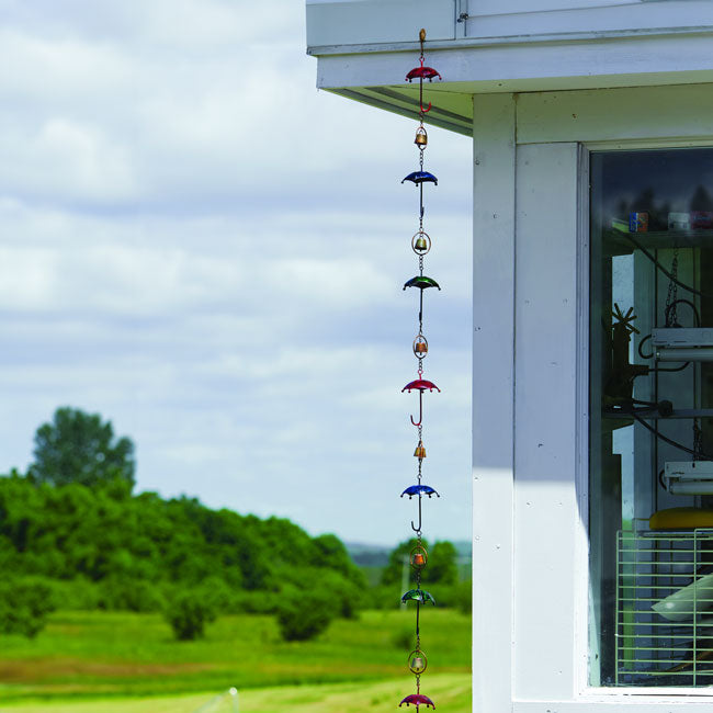 Add a whimsical hint to your rain collection using these Ancient Graffiti Umbrella and Bell Rain Chains. The recognizable umbrella shapes and vivid colors of these two chains are sure to capture attention, while the small bells add a gentle sound to each unit. These chains handily replace downspouts on your home, and direct rainwater from the gutter to the ground. Familiar umbrella shapes further the precipitation motif, and their red, green, and blue hues add vivid style to the setting. A shining finish on each umbrella helps them gleam in the sunlight, and these figures alternate with an iron bell inside a ring for wonderful contrast. The included gutter clip makes it easy to install each item, and a small hook at the bottom of each connects to a rain basin (not included) if desired. Each accent on the chains is removable, allowing you to adjust the pieces to fit your home, and their iron construction lasts for many seasons. Highlight rain in your garden with these Umbrella and Bell Rain Chains.