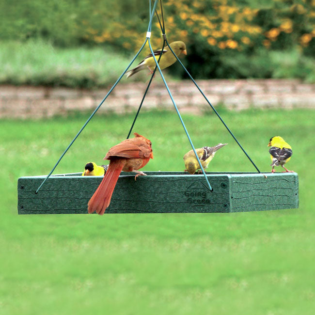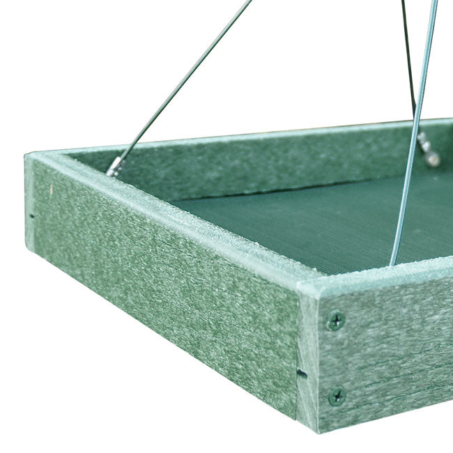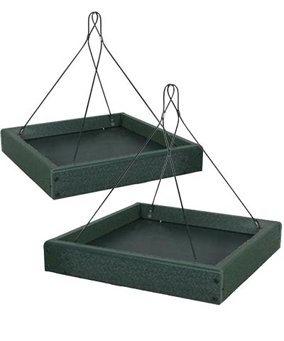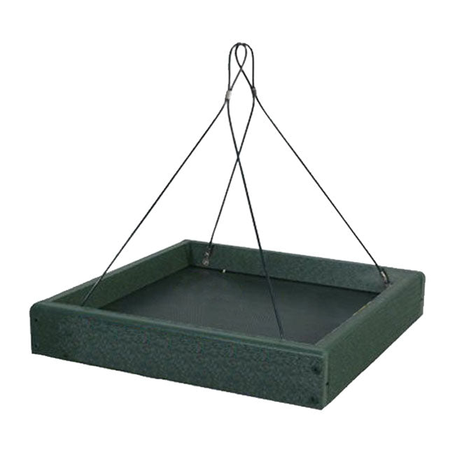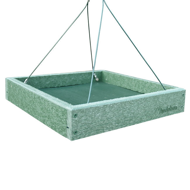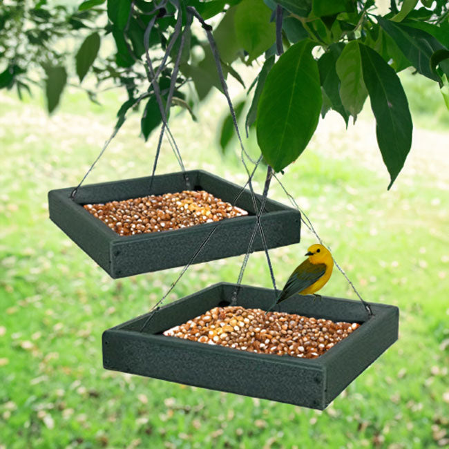 Provide your neighborhood birds a wealth of food options and dining spots with these Audubon Green Recycled Plastic Platform Bird Feeders. These two, environmentally friendly feeders add versatile and lasting feeding stations to your bird sanctuary, while reducing landfill waste. Each square frame, made from up to 90% post consumer plastic, sports a faux wood grain and deep green hue. A steel screen forms the base of each feeder, and its green color meshes with the frame. This feeding area handily holds up to 2.4 quarts of bird seed, as well as standard suet cakes, seed cakes, or fruit. Its open design allows several birds to reach the feed, and the screened base helps water drain. Attached cables make it simple to hang these platforms from a bracket, or for more versatility, attach them beneath your existing hanging feeder to capture tossed seed and hulls. The durable, plastic lumber frame will not peel, crack, rot, or warp, and is designed to resist mold for a healthy bird population. The robust construction and open design also make these units simple to clean and refill, while inviting a bevy of birds to dine. Offer many types of food to your feathered friends with these Green Recycled Plastic Platform Bird Feeders. Made in the USA.