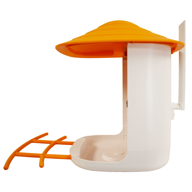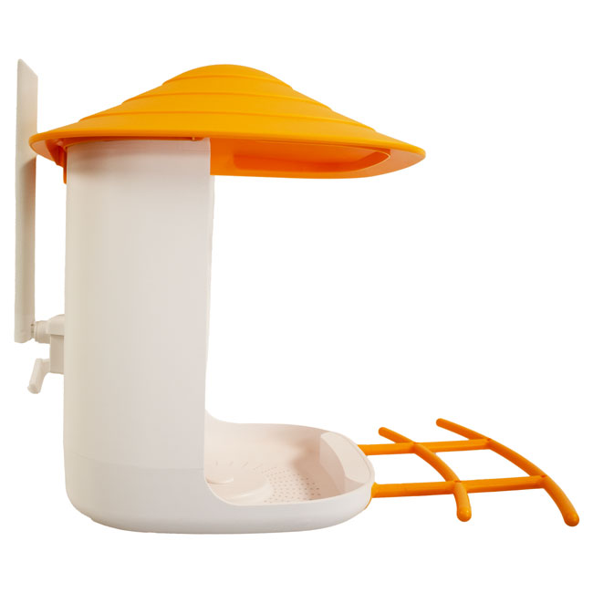 - Front supports an orange, plastic perch assembly for birds to comfortably rest and dine