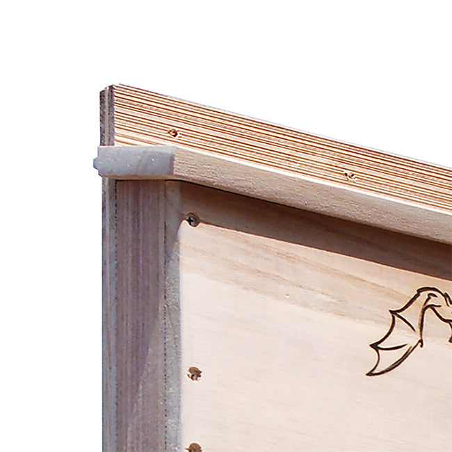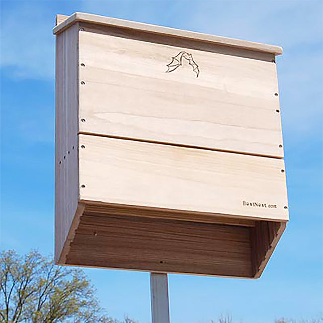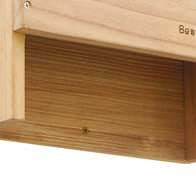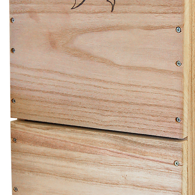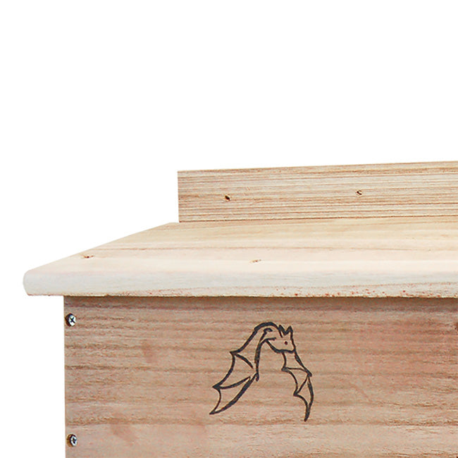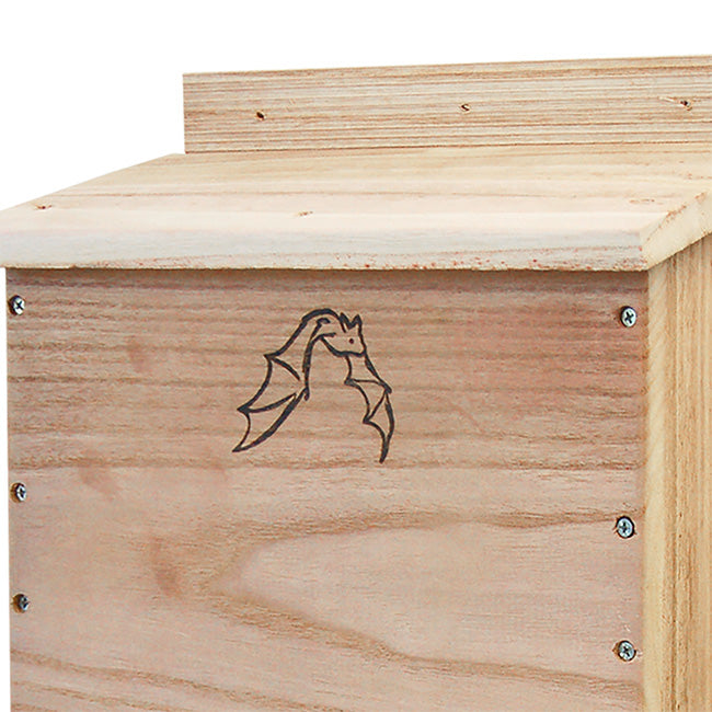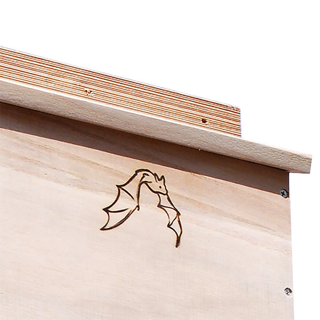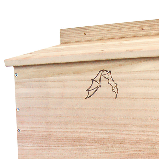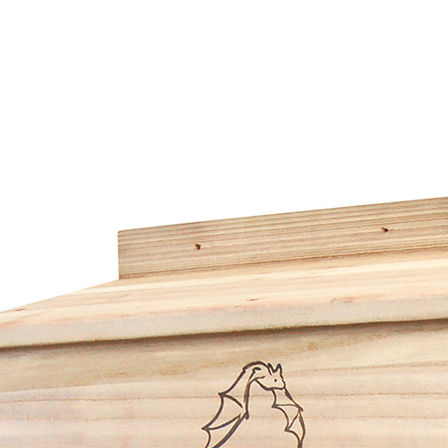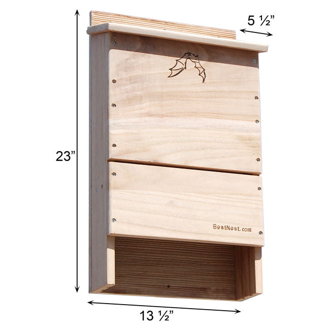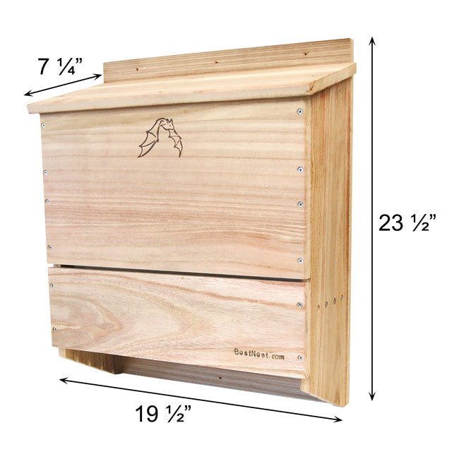 Invite a beneficial colony of bats into your backyard with the BestNest Bat House. Meticulously designed for efficiency, this sizable bat house will allow for a much higher occupancy percentage than smaller units. The interior chamber surfaces and reinforced landing platform are crafted from deeply grooved wood, creating an excellent clinging surface for landing and roosting bats. Each of the three chambers measures 1" deep, while a 0.25" ventilation slat in the front helps to regulate temperature and increases air circulation. The slanted roof offers a unique tongue and groove assembly to keep the interior dry and safe from the elements. A beautifully designed emblem of a bat in flight adorns the front surface, and the furniture grade wood construction is built to last. This house may be mounted to a vertical surface with any of the three predrilled holes at the top and single stabilizing hole at the bottom. Bring these interesting and helpful creatures into your yard with the BestNest Triple-Celled Bat House.