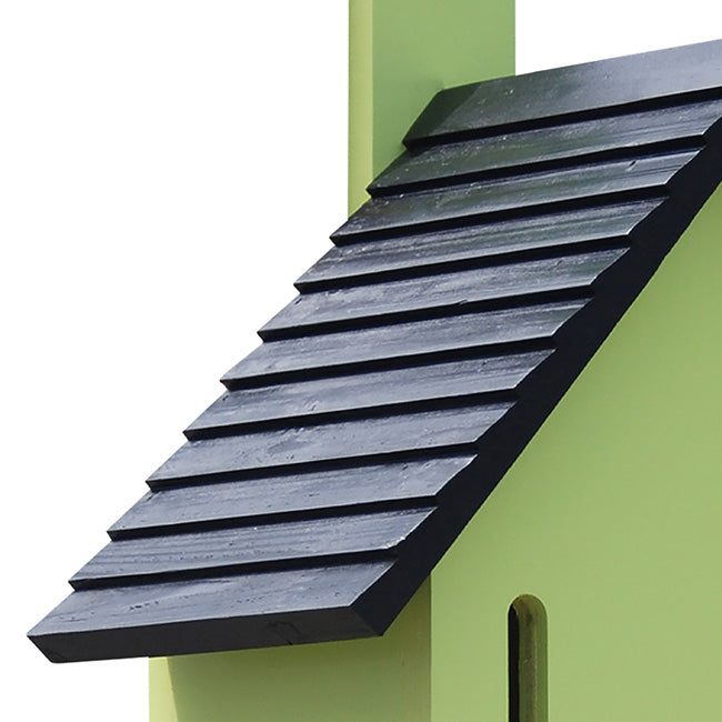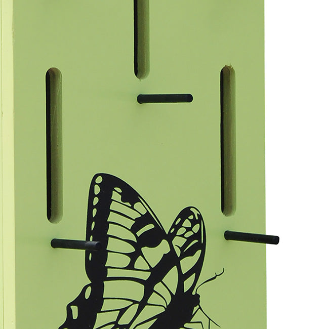 Start a beautiful butterfly garden in your backyard using the BestNest Green Classic Butterfly House with Perches. Offering these lovely and elusive insects a shelter allows them to rest during their migration, or helps them stay protected in rainstorms. This tall, pastel green unit has five separate oval slots on its face, each with a black wooden perch underneath. These openings mimic crevices found in wood piles or bark, which butterflies naturally use for protection and shelter. A detailed butterfly image occupies the base of the home, and the black, lapped roof completes the stylish piece. A hanging tab on the back of the roost swings upward, for you to mount the item onto a post or tree in moments with the included screw. The soft green color enhances nearby foliage, and the wooden construction furthers the natural theme. Provide butterflies a fantastic shelter in your garden with this Green Classic Butterfly House with Perches.