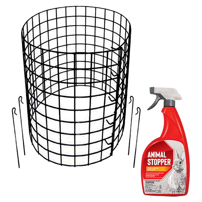 Create an all-around effective station to protect your crops and vegetables from pesky animal behavior with the Bunny Barricades & Animal Stopper Spray Kit by Prime Retreat. These safe and convenient items give you a comprehensive means for safeguarding your garden growth from the unwanted attention of rabbits and other animals, letting you establish a bustling and vibrant garden you can enjoy for many seasons. Place the included 10 pack of Erva Bunny Barricades around your tulips, roses, or lettuce to create a staunch barrier to rabbits, preventing them from spoiling your blossoming plants. Strong, metal construction and vinyl coating protect each barricade from outdoor elements, and a hook closure lets you wrap each unit around a plant up to 12" in diameter. Add extra protection to your growing efforts with the included bottle of Messinas Ready to Use Animal Stopper, a convenient formula containing cornmint oil, rosemary oil, and putrescent whole egg solids to naturally deter pests. Simply use the classic spray nozzle to apply a mist on your property that will defend against rabbits, groundhogs, raccoons, and more. For added versatility, connect two or more of the barricades together to create a barrier for larger plants, and the included metal anchors make it simple to secure each unit directly into your garden soil. Set up a station for your crops and growth to thrive and keep animal pest behavior at bay with this ingenious Bunny Barricades & Animal Stopper Spray Kit. Made in the USA. Thirty day guarantee for the Animal Stopper Spray.