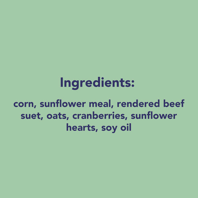 - Made from cranberries, oats, and sunflower meal in a rendered beef fat base.