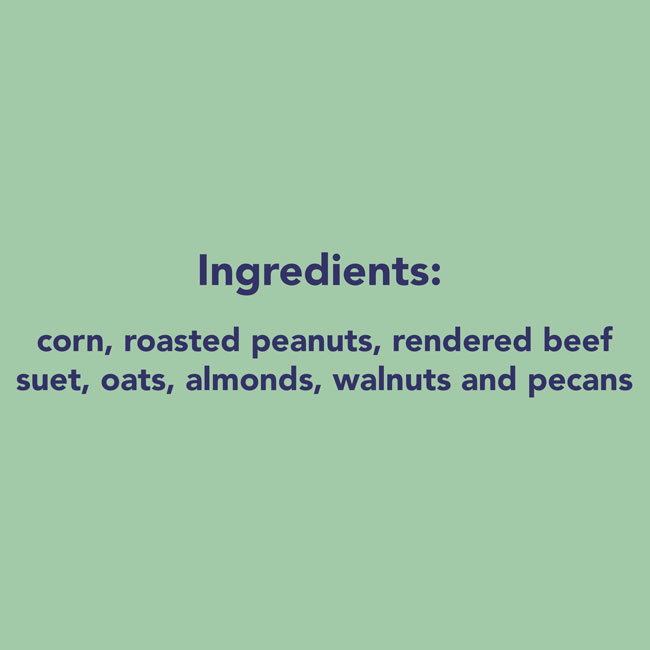 - Nutritious cylinders contain rendered beef suet, roasted peanuts, oats, almonds, and other nuts.