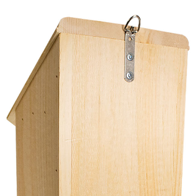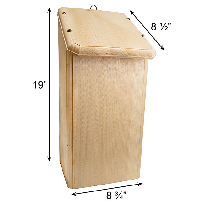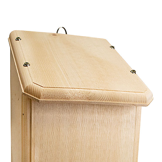 Give a spacious and comfortable home to bats in your yard with this Coveside Bat Condominium. Bats are a useful tenant in many backyard gardens, as they eat insects at night to offer you a natural form of pest control. This sturdy home is made of traditional northeast pine to create a durable and unique roost for as many as 50 bats to comfortably populate. Four separate chambers and a generous, tall design allow ample space for helpful bats to find solace in your yard as they cull the presence of pests, and the open bottom facilitates easy entry while preventing squirrels, birds, and insects from gaining access. The rough hewn pine creates a multitude of spots for bats to easily grip the surface, and the narrow design allows the item to retain heat for maximum interior comfort. The unfinished wood construction adds a rustic and quaint look to the piece, providing you a handsome accessory while lending bats a safe haven, and a sturdy metal hanger on the back allows it to be easily placed on a wall or tree. Invite bats to create a thriving community as they moderate your yard's pest population with this Bat Condominium. Made in the USA.