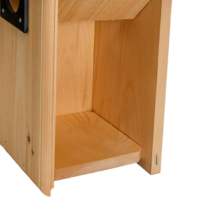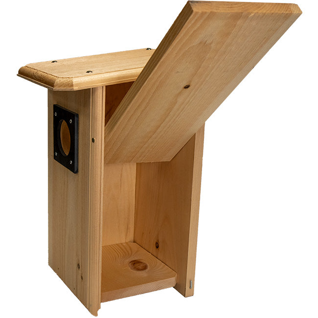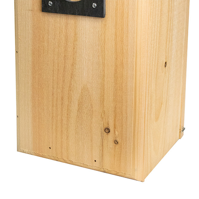 Provide northern flickers a lasting shelter designed to specifically meet their needs when you place this Coveside Flicker House in your bird garden. These common woodpeckers readily utilize manmade bird houses, and this durable pine option wonderfully creates a quaint respite for these feathered friends. The 2.5" diameter entry hole allows these birds access to the deep chamber, while its slate guard is made from authentic, century-old roofing material from the northeast, giving you a unique feature to prevent other woodpeckers from enlarging the entryway. A downward slanted roof sports a generous overhang to add protection against unwanted weather conditions, and rounded edges on the roof keep water from dripping into the shelter. Gaps in the corners of the natural, pine base provide additional drainage to ensure that the home's inhabitants remain comfortable and dry. An included bag of wood chips simulates the natural roosting activities of these flickers, providing a useful accessory as you help them establish a reliable habitat. The 0.75" thick pine boards insulate the domicile, and ventilation slots just under the sides of the roof keep the internal temperature well regulated for optimal comfort. A single side panel lifts upward for periodic nest checks or seasonal cleanings, and the unembellished pine body will age to a striking gray for a striking and varied look among your landscaping. A metal loop hanger on the rear panel of the nest box encourages you to place it against your wall or fence line, or you may add a mounting bracket (not included) to handsomely display the home on a pole or post. The robust construction of this handy abode gives you a wonderful dwelling that will remain vibrant in your bird sanctuary for many seasons of service, inviting new birds to peacefully nest in your area. Beautify your garden and attract activity and entertainment from feathered friends with this Flicker House. Made in the USA.