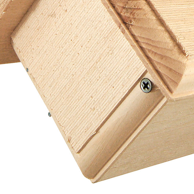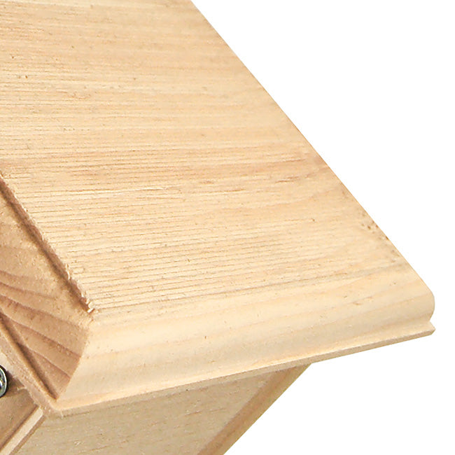 Invite melodious Carolina wrens into your backyard bird garden with the Coveside Hanging Carolina Wren Bird House. These active birds share their songs throughout the day, and offering them this comfortable domicile provides them a safe dwelling you can observe right in your backyard. Much like house wrens, Carolina wrens don't mind a house that sways, and the aged pine construction of this unit is sustainably sourced to give you an exceptional and durable roost for these feathered friends. The pitched roof overhangs the body of the house on all sides, protecting the interior from rain and harsh weather. Extended ventilation slots along the sides of the roof keep the internal temperature of the home cozy and well regulated, while a pair of angled corners at the base of the house offer drainage to the nest, keeping it dry. The abode's wide opening specifically accommodates large sticks, giving wrens the chance to bring their material in for a comfortable nest, and the rough hewn pine lets nestlings get a reliable grip when they are trying to exit the box. One side panel lifts upward for easy cleaning and nest checks, and a small metal latch in the corner keeps the shelter securely closed. The 0.75" thick panels lend ideal insulation to the home, while the light color of the unfinished pine assists in keeping it cool during the summer. This unit will age to a graceful and fetching gray tone over time and with exposure to the elements, providing dynamic beauty to your backyard décor. Use the attached chain to easily hang this house from a tree branch or wall bracket for a dazzling, quaint showcase. Offer a comfortable roost that appeals to Carolina wrens with this Hanging Carolina Wren Bird House. Made in the USA.