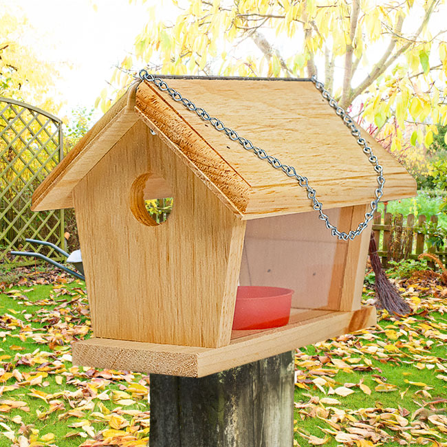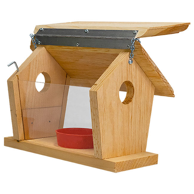 Offer delicious fruit or mealworms as a treat to bluebirds and other favorite songbirds by showcasing this Coveside Small Fruit and Mealworm Bluebird Feeder. This unique feeder sports a durable frame constructed of pine, along with a pair of plexiglass side panels to allow up close and easy viewing of feeding activities. Each end of the feeder features a 1.5" diameter entrance hole to beckon bluebirds and various songbirds to easily access the snacks contained within, while larger birds and any other unwanted pests will not be able to enter. A large hinge spanning the length of the roof enables it to easily flip upward for simple cleaning and refills as you place up to 0.15 pounds of fruit, berries, or seed in the built-in, red cup on the interior's floor. Place mealworms or insects around the feeding cup to add an extra option and entice bluebirds to visit and dine. For even more versatility, stock the interior feeding receptacle with sunflower or mixed seed to attract small songbirds for a nutritious and pleasant feeding experience. The clear sides allow you an unencumbered view as multitudes of birds dine, giving you hours of entertainment as you help sustain your local avian population. The sturdy pine construction adds a natural and rustic charm to this handy feeder, and will hold up throughout many seasons of reliable service. It will also age to a natural gray hue over time and exposure to outdoor conditions, giving you a piece that will transform in beautiful fashion with extended use. The attached chain allows you to hang this feeder from a hook or branch, or use a mounting bracket (not included) to connect it to a post for a different method of display in your landscaping. Transform your bird garden into a nutritious and welcoming respite for bluebirds and more using this Small Fruit and Mealworm Bluebird Feeder. Made in the USA.