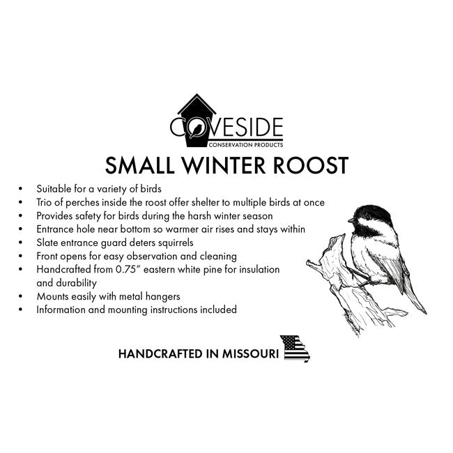 Offer songbirds a warm retreat from harsh winter weather using the Coveside Small Winter Roost. This roosting box features a 1.5" entrance opening at the bottom, ideal for keeping warmth within the box as birds rest. As warm air rises, it is trapped inside the abode rather than exiting through the entrance hole, ensuring that residing birds will remain toasty. A trio of perches inside the shelter offer room for several birds to comfortably roost at once, and the front of the box lifts upward for easy cleaning and observation, with an "L" shaped metal hook keeping the panel securely closed. The small entrance hole is protected by a repurposed slate guard sourced from old Maine architecture to discourage pillaging squirrels, and this unit's slanted roof allows water to run off of it, rather than into the home as birds take solace from the elements. Use the included metal hanger to easily mount this roost on a tree or post, facing the entrance away from prevailing winds for maximum protection. Handcrafted from solid, eastern white pine, this shelter will age to a beautiful silver patina, and will never need to be painted or stained. Give birds the comfort and safety they need to hunker through the winter elements with this Small Winter Roost. Made in the USA.