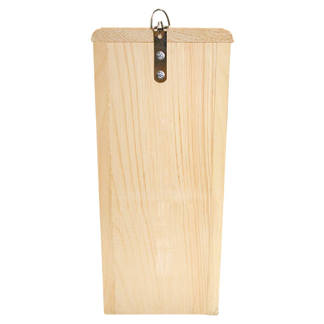 Encourage easy nesting for wood ducks using the Coveside Small Wood Duck House. This sustainably grown eastern white pine house is a gorgeous solution for wood ducks, which are incapable of excavating a nesting cavity and must rely on existing holes or man-made habitats for shelter. A spacious, 4" wide and 3" tall front opening offers an easy entryway for ducks, and this specially designed structure includes wood chips for use as nesting material so that eggs remain insulated and will not roll around. A slanted roof as well as drainage and ventilation openings ensure that the nest cavity stays dry and fresh, keeping the house neat and comfortable. The interior is roughened and has a wire ladder affixed to the inside front panel, providing a way for ducklings to climb out of the box and swim with their mother. Mount the nest box against a post or tree with its attached, back metal hanger, and angle it slightly forward to help ducklings as they use the ladder to exit the shelter. The pine construction offers ample insulation and will give ducks a familiar, inconspicuous nesting site as it weathers and turns gray with time. Simply tilt up the front panel for easy seasonal maintenance. Help roaming wood ducks find safe shelter by adding this Small Wood Duck House to your acreage. Made in the USA.