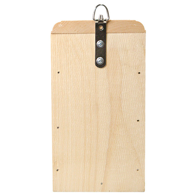 Bring the magnificent music of bluebirds into your garden while deterring threats to their home with this Coveside Sparrow-Resistant Bluebird House with Open Top. This intuitively designed box prevents sparrows from overtaking the roost, while giving bluebirds a habitat they can comfortably populate. Research indicates that bluebirds utilize a slot entry, whereas sparrows gravitate toward a round hole. This brilliant pine unit is responsibly sourced from aged eastern pine for a unique and eco-conscious dwelling, and its 4" long and 1.25" high, rectangular entry caters to the needs of these musical birds. A sizable roof angles downward to guard the inside of the home from rain and other elements easily. An included, 1.5" thick, pine block can be situated within the home to shrink its depth, discouraging sparrows while tailoring this unit even more to the roosting habits of bluebirds. Situated atop the roof is a black, plastic grid to prevent large bits of detritus as well as predatory threats. Use the included white, plastic cap to cover this opening, employing it instead as a shallow dish for mealworms or other caloric snacks. Triangular corners just below the gaps of the roof facilitate proper air flow and temperature regulation, and a metal latch allows you to lift the dwelling's front panel upward for regular nest checks and cleanings. This abode's rough hewn interior gives ample grip to nestlings looking to navigate out of the house, and this naturally beautiful item will weather to a striking gray tone with time and exposure to outdoor conditions for a charming transformation. Utilize the attached, back hanger to showcase this handy home against a post or wall, or pole mount it with a mounting bracket (not included). Keep the threat of unwanted sparrows away from fantastic bluebirds with this Sparrow-Resistant Bluebird House with Open Top. Made in the USA.