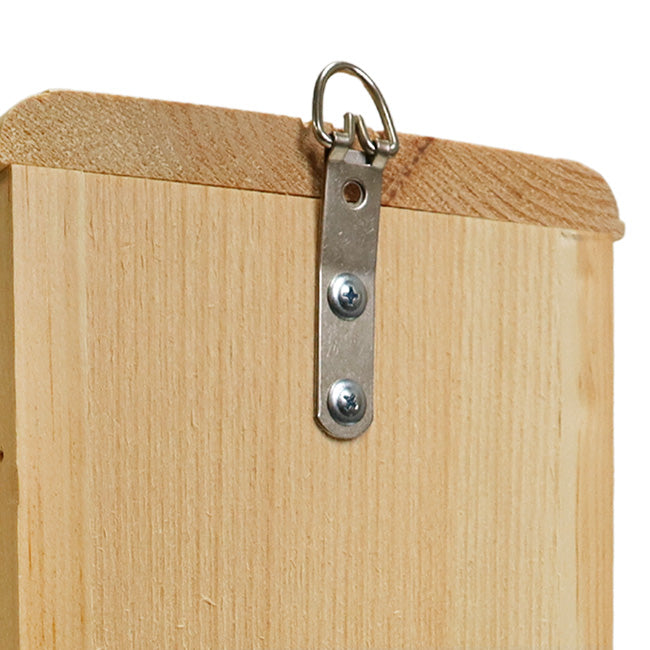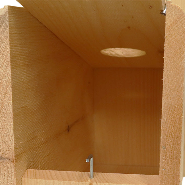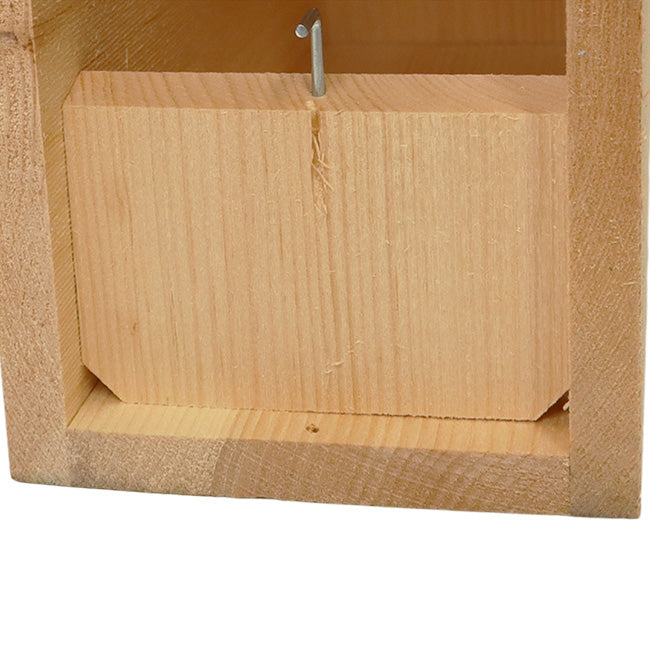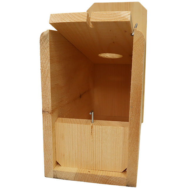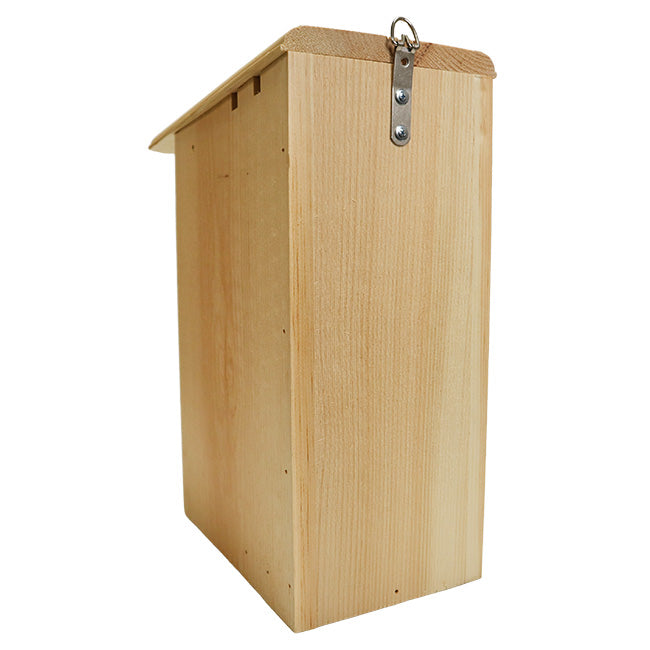 Prevent starlings from disrupting the home of flickers by placing this intuitive Coveside Starling Resistant Flicker House in your garden. This innovative home is designed to meet the needs of flickers, utilizing their natural tendencies to give them a comfortable roost. The shelter's front panel slants inward as it gets closer to the base, letting flickers climb it in the the same manner they would a tree. A helpful plexiglass shield rests inches away from the 2.5" diameter entrance hole, deterring starlings from flying directly into the nest while encouraging a flicker's natural climbing tendencies. Constructed of aged pine and sourced from a family owned mill using ecologically friendly forestry practices, this unit has a natural, rustic flair that will lend staunch durability to your birding efforts. The slanted roof features a significant overhang to protect the interior of the house from precipitation, while small gaps on either side of the home keep the internal temperature well regulated. Angled corners on the base panel offer drainage, allowing the roost to remain dry, and the deep design prevents predators from reaching the interior. The rough hewn pine gives nestlings a secure and steady grip when they venture outside of the nest. The front panel sports a small metal latch to keep it securely closed, and it can be lifted upward to allow easy nest checks and maintenance. The 0.75" thick pine provides insulation to the home, while the unfinished pine's light tone aids in keeping it cool during hot summer months. A bag of wood chips is included within the house to offer additional nesting material and heat retention. The natural pine will age to a charming gray color over time and with exposure to the elements, letting you enjoy variable beauty as this wonderful item enhances your landscaping. A metal hanger at the top of the back panel along with a predrilled hole near the base allow you to post or tree mount this helpful domicile in your yard with ease. Keep starlings away from flickers as they roost with the Starling Resistant Flicker House. Made in the USA.