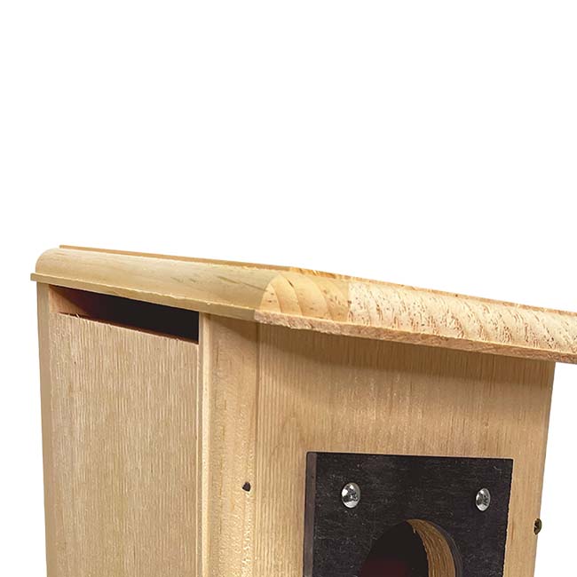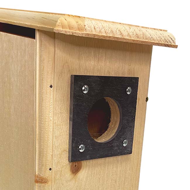 Celebrate woodpeckers and provide them a lasting home by placing this Coveside Three Woodpecker House in your bird sanctuary. These elusive birds are well known cavity nesters, and readily roost in manmade homes. This classic, all pine abode is perfectly sized for red-headed, hairy, or red-bellied woodpeckers, with its deep body and 2.25" diameter entry. A slate square is sourced from old Maine architecture, repurposed from recut slate roofing tiles, and surrounds this entry, preventing birds from enlarging it, while the roof slopes downward, overhanging it for a dry nest. Additional gaps in the corners of the base offer drainage, and one side panel swings upward to seasonally clean the roost. Its natural, yellowish hue and top gaps prevent nestlings from overheating, and a metal hanger on the back aids in mounting the home. As woodpeckers regularly excavate cavities in decaying trees, the nest box also includes a generous bag of wood shavings to better attract these birds and encourage their natural tendencies. The roughened interior of the roost aids nestlings in reaching the exit when ready, and its 0.75" thick, pine wood construction fantastically insulates the cavity. Encourage small woodpecker species to nest near you with this Three Woodpecker House. Made in the USA.