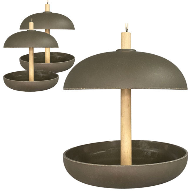 Bring a minimalist touch to your yard while feeding a variety of local birds using the Eco-Friendly Covered Platform Bird Feeder. This feeder has a simple design and neutral color, allowing it to blend into the environment while offering up to 0.61 quarts of seed. The muted green color of the dome and basin is complemented by the wood column through the center, making for an all-around natural look. The column extends through the domed top and has affixed to it a small metal hook and rope loop for straightforward hanging. This feeder is constructed with hardy biodegradable material made up of 75% bamboo fiber and 25% resin, providing an environmentally-conscious and durable addition to your outdoor area for many seasons. Feed backyard birds this season with a safe and guilt-free dining spot thanks to this Eco-Friendly Covered Platform Bird Feeder. Some assembly required.