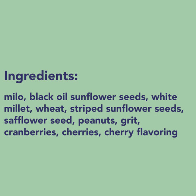 - Feed features black oil sunflower seed, milo, and added fruit pieces.