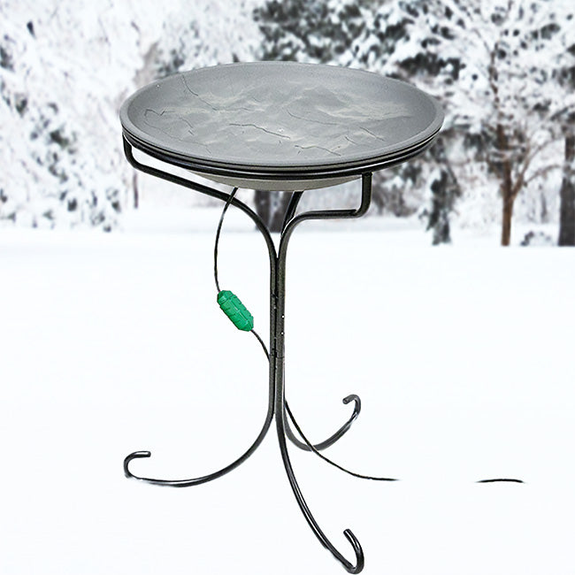 - Package of a Wild Bird Lover’s Slate Colored Heated Bird Bath with Metal Stand, as well as a Farm Innovators Green Watertight Cord Connector and Allied Precision Lock-N-Dry Power Supply Cord adds a focal point to your outdoor area.