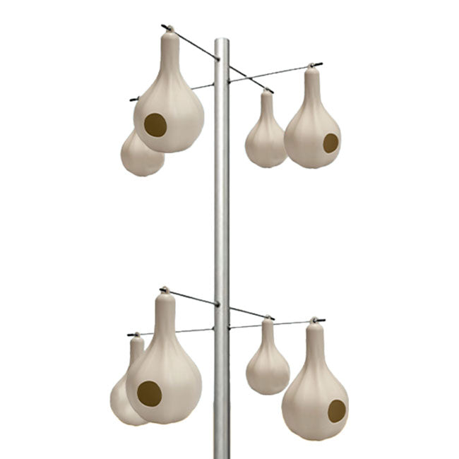 Establish a fantastic purple martin housing station on your property with the amazing Wild Bird Lover's Purple Martin Gourds and Pole Package. This all-around package gives you 8 outstanding Wild Bird Lover's Single Purple Martin Gourds for you to display handily on the included Wild Bird Lover's 4 Over 4 Aluminum Pole for 8 Gourds, allowing you to set up an extensive martin haven in moments. The eight, included gourds hint at days of old when hollowed gourds served as housing for migratory purple martins, and the 2.125” diameter entry hole of each unit gives safe access to martins. A 6.25” diameter, interior nesting area in each gourd lets martins place their eggs deep enough to be free of predation, and a hole on each slightly flattened base facilitates ample drainage for a clean habitat. Use the integrated top loop on each gourd to attach it to the included pole. This staunch, hardy pole sports four, easily connecting sections for a total elevation of 14’, as well as a ground socket for stability as you display these items in your bird sanctuary. Included, 20” long rods are oriented in dual X designs to hold the cache of gourds, transforming your outdoor space into a fully fledged martin retreat. Rubber washers help to keep the rods snug, while additional washers and pins position the gourds at the end of each arm for flight clearance; a plastic cap tops the pole to prevent the pooling of rain, while the aluminum body remains rust free for a lasting and lightweight display. Proudly showcase this pole and gourds setup in a convenient spot among your natural surroundings; the plastic, durable bodies of the gourds provide you birding accessories that will stand the test of time as you give these entertaining martins a safe and reliable home on your property. Create a safe and wonderful martin station among your outdoor décor with the outstanding Purple Martin Gourds and Pole Package. Assembly required.