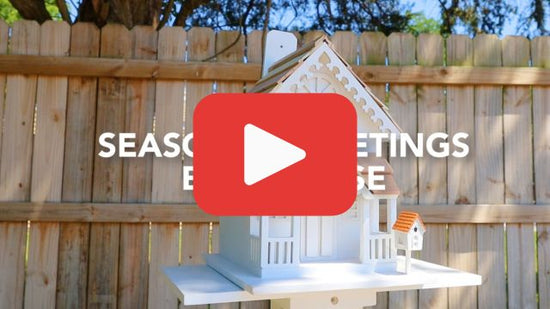 Integrate a bird house into your garden décor throughout the year with this Home Bazaar Season’s Tweetings Bird House. Not only will this detailed, all white shelter provide a convenient nesting site for small songbirds; its included, changeable accents enable you to keep it fresh and fun for each season. The extended front porch with overhanging roof and dormer perfectly create a welcoming effect for both songbirds and garden visitors, and intricate detailing throughout the roost captures attention. Trim on the top roof line enhances its steep pitch, and this overhang protects the 1.25" diameter entry and interior nesting area from the elements. Additional gaps beneath this overhang ventilate the shelter, and a bottom hole provides drainage. Hardware cloth beneath the entry enables fledglings to climb upward and reach it when ready to fly, and a generous, rectangular platform supports the domicile. A small depression in the front corner of this platform accommodates the included wooden accents, turning this shelter into a garden focal point. A replica bird house and stylized American flag are great for the summer, while a football and jack-o-lantern figure can be placed here through the fall. Switch that for the Christmas tree in the winter to celebrate throughout the year, with its green color brightly contrasting the white home. A significant back panel removes for nest checks and maintenance, and a tab swings upward to place the piece against a wall or fence post with ease. Rest its flat base on a level surface indoors for a different display, or attach a mounting bracket (not included) to the base for pole or post mounting. Decorate for each season in moments using this Season’s Tweetings Bird House.