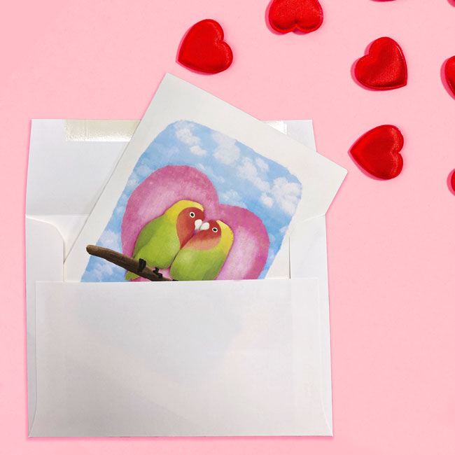 Give a heartwarming and personal greeting to a loved one with this magnificent and vibrant “Lovebirds” Greeting Card by Prime Retreat. This cream-toned card’s adorable cover depicts a pair of bright and colorful lovebirds in front of a lovely heart and blue sky, standing closely together on a branch in a display of affection. The interior of the card sports a short poem to help deliver your heartfelt message. This greeting card is perfect for anniversaries, weddings, and other loving occasions, and included with the card is a cream-colored envelope for easy delivery and standout presentation. Send an affectionate greeting to someone close to your heart by gifting them this “Lovebirds” Greeting Card. Printed in the USA.
