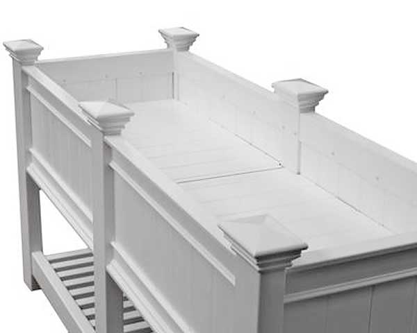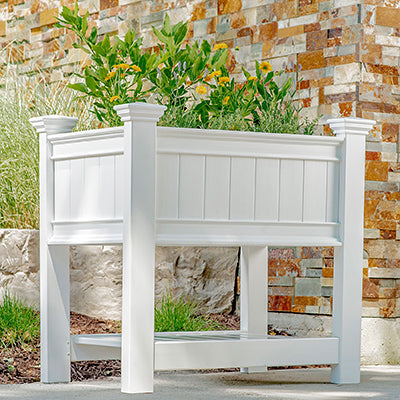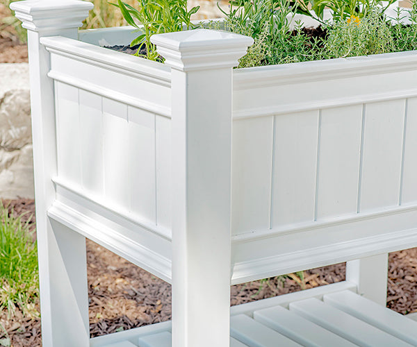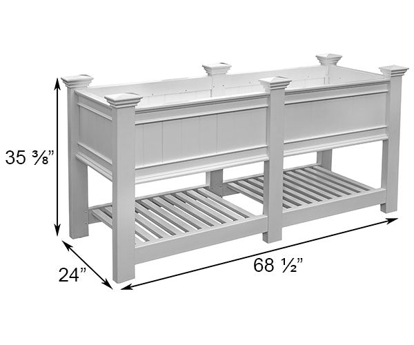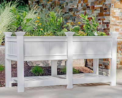 Add a wonderful, lengthy planting area to your deck or patio with the New England Cambridge Raised Planter Bed with Extension Kit. The convenient size, hardy construction, and architectural hints make this planter a fantastic addition to your yard, turning any area into a gardening zone with ease. White, vinyl posts place the New England Cambridge Raised Planter Bed at a wonderful, 35.375" overall height, and the large slats along the sides of the piece evoke beadboard, for a traditional hint. These panels create a 10.5" deep planting area, perfect for herbs, flowers, or even a few vegetables, and its slatted bottom shelf provides storage for your garden tools. Attach the included New England Cambridge Raised Planter Bed Extension Kit to one side of this structure, to easily double the planting and storage area. The lasting, all vinyl construction will remain crisp white without yellowing, warping, or rotting, and will need only an occasional rinse with a garden hose to stay beautiful. Turn your apartment balcony into a home garden using this Cambridge Raised Planter Bed with Extension Kit. Assembly required. Twenty year warranty.