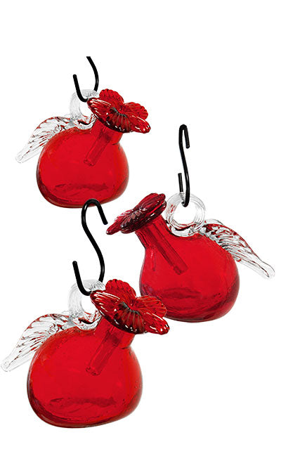 Bring fantastic style into your bird garden using these Parasol Red Pixie Hummingbird Feeders. The adorable shape and compact size of these 3 feeders make them perfect for hanging in your landscaping, and their vivid red tone lends an exciting look to any setting. A rounded body and extended neck on each create a charming shape, while clear glass wings on the back form a fairy silhouette. The reservoirs hold 4 ounces of nectar each, and a red feeding flower rests in each opening for hummingbirds to dine. A blown glass loop and included, metal "S" hook make it simple to hang these feeders in moments, and the translucent quality keeps nectar levels visible. Crafted from recycled glass, these hand blown vessels lend environmental awareness to your garden, along with incredible style. These pieces clean easily, and the open neck of each makes refilling simple. Enhance your bird garden with spritely style using these Red Pixie Hummingbird Feeders.