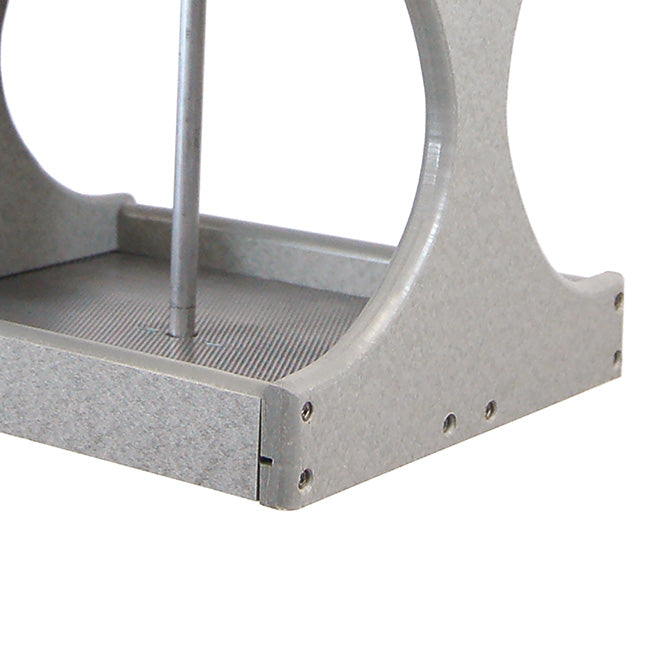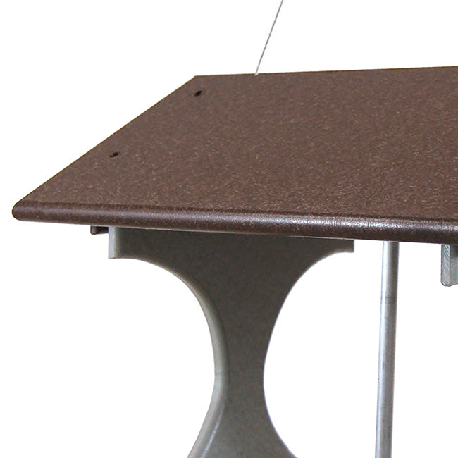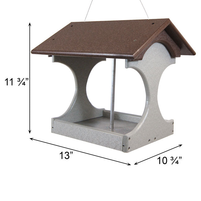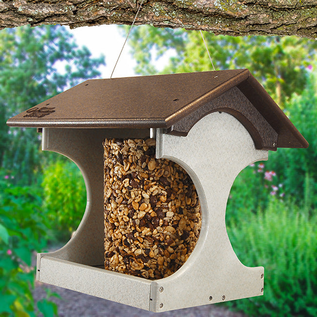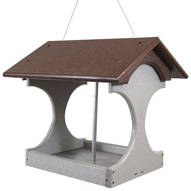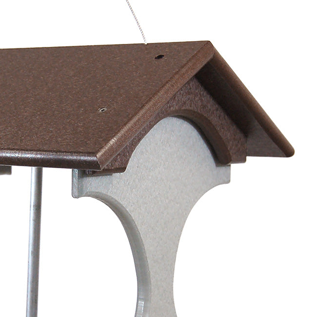 Enhance your bird feeding repertoire by placing this Brown and Gray Amish Made Recycled Plastic Suet Log Bird Feeder in your yard. The natural tones and unique design of this item adds an unexpected look to your landscaping, while offering birds a fun dining option. An upright, metal shaft forms the center of this piece, perfect for holding an 8" tall or shorter suet or seed log. A metal, mesh tray captures any suet pieces or seed hulls, and offers plenty of drainage. Its generous, pitched roof covers this tray, and gray uprights create a striking, fly-through design. Swing this roof upward to refill or clean the unit, and hang it using the attached cable and metal loop. For a different effect, attach a 1.75" diameter or smaller adapter to the bottom support beam and pole mount the feeder. Its durable, recycled plastic lumber body forms a lasting unit while diminishing landfill waste, and the gray and brown tones mesh with the outdoors easily. Create a unique dining spot for your feathered friends with this Brown and Gray Amish Made Recycled Plastic Suet Log Bird Feeder. Made in the USA.