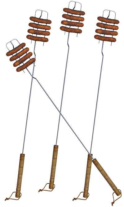 Ensure your children remain safe while cooking over a campfire with the Rome Safe "T" Fork Reversed Grilling Fork. The clever design of this unit helps prevent accidents, thanks to its inverted tines. This original style keeps the tines from harming others, and also makes storage easier and safer. Their 6.75" length and the offset shaft beneath them allows you to cook up to 6 hot dogs at once, while the chrome plated steel construction heats quickly and evenly for a meal in moments. The 25" long shaft keeps you or your children safely away from the flames, and an extra long, 9" wooden handle creates a sturdy and insulated grip. Roast several campfire treats at once using this Safe "T" Fork Reversed Grilling Fork.