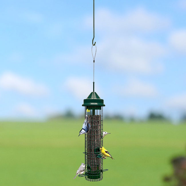 - Four seed ports on the feeder give birds multiple places to enjoy their food.