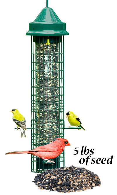 Enjoy feeding birds, and not squirrels, using this Squirrel Buster Classic Bird Feeder with Divine Blend Seed. Voted "Best New Product" by the retailers at the Bird Watch America Birding Show in January of 2006, the Brome Squirrel Buster Classic Bird Feeder is loaded with features that will certainly stop squirrels from raiding it, while still allowing birds to dine. An ingenious, weight sensitive cage surrounds the plastic seed tube, and its spring mechanism is calibrated to four ounces, so nuthatches, chickadees, and finches can feed easily. Four seed ports near the base offer places for your feathered friends to sit and dine, while the wire shroud provides a wealth of perching spots for woodpeckers or nuthatches. When an animal larger than four ounces places its weight on one of the perches, the cage lowers and metal shrouds close access to the seed ports. Fill the reservoir with up to 1.4 quarts of the included Wild Bird Seed Mix, Divine Blend, and monitor feed levels through the clear plastic of the tube. The item's unique, seed ventilation system helps air circulate through the reservoir, for fresh and dry feed, and the lid locks into place to keep squirrels from lifting it. The unit disassembles without requiring any tools, for in depth cleaning, and a metal cable at the top makes hanging it simple. Its thoughtful design features create a fantastic, squirrel proof feeder, while the plastic and metal construction is sure to last through years of use. Help your favorite birder feed their feathered friends, and not squirrels, with this Squirrel Buster Classic Bird Feeder with Divine Blend Seed. Limited lifetime warranty on feeder.