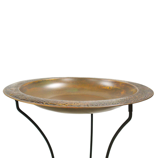 - Significant, Ancient Graffiti Copper Plated Steel Bird Bath and Stand has an embossed, decorated rim and copper colored finish for elegance.