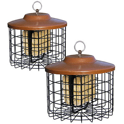 Surround your bird garden with a bevy of suet feeding stations using these Stokes Select Brown Caged Double Suet Feeders. This set of 2 caged, circular units creates dining spots for several of your smaller feathered friends, and a brown roof on each protects food from the elements. The feeders both accommodate 2 standard suet or seed cakes, and 1.5" square openings enable small birds to enter and eat. The open top on each suet holder makes refilling simple, and the 9.75" diameter of the cages provides plenty of protection. A threaded finial atop each brown, all metal lid prevents squirrels from lifting them, while a hanging ring allows you to place the pieces on a hook or bracket. A black, plastic coating on the frame protects each unit from squirrel damage, and the brown finish on the metal caps adds a natural hint. Discourage squirrels and large birds from dining while providing suet to small birds with these Brown Caged Double Suet Feeders.