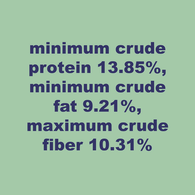 Guaranteed Analysis: minimum crude protein 13.85%, minimum crude fat 9.21%, maximum crude fiber 10.31%