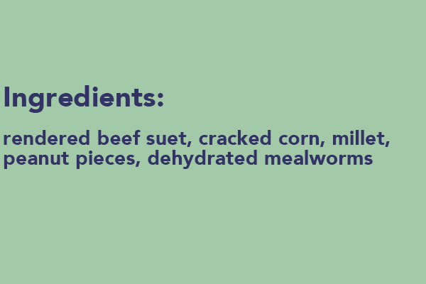 Ensure that insects and nut-loving birds thrive throughout the harsh winter by offering them this pack of 24 robust Wildlife Sciences Mealworms and Nuts Suet Cakes. Made from rendered beef fat, suet offers high metabolism birds the energy and fat reserves they need to survive frigid months when insects are scarce. Dehydrated mealworms are embedded in each of these 24 suet cakes, along with pieces of peanuts and corn, providing an option that you can spread all around the bird sanctuary to replenish the appetites and energy levels of various feathered friends. These delectable snacks will attract a variety of songbirds to the garden, and each cake is easily accessible in a convenient wrapper for mess free handling while fitting into standard suet cake feeders. The melt-resistant formula of each cake makes them suitable and appealing for year-round use, and the generous allotment of units allows you to fully outfit your backyard with these nutritious treats, making sure no bird is left without a scrumptious morsel. Introduce a new approach to your bird feeding efforts by offering these handy Mealworms and Nuts Suet Cakes in your bird garden. Made in the USA.