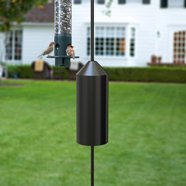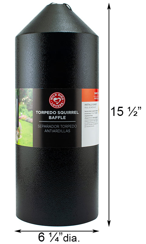 Protect pole-mounted birding items from squirrels and other animals with this pack of 3 Woodlink 2-Piece Black Torpedo Baffles. These lengthy, torpedo style baffles slide easily over your existing 0.5" to 1.375" diameter poles or shepherd hooks, and stay locked in place with included couplers. The innovative 2-piece design of these items allows you to place them onto existing shepherd's hooks, unlike standard torpedo baffles. Their durable steel construction and black, powder-coated and textured finish keep them protected from the elements and local wildlife while still offering plenty of strength. These pieces create physical barriers between the ground and your birding items and are sized for preventing squirrels and other critters from reaching the houses or feeders. Stave off squirrels by protecting your pole and shepherd hook-mounted outdoor accents with these 2-Piece Black Torpedo Baffles.