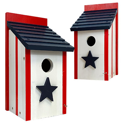 Bring your love of country to the forefront of your landscaping using these Woodlink Patriotic Bluebird Houses. Vivid red, crisp white, and navy blue paint throughout these 2 wooden shelters perfectly evoke the American flag, while the abodes fantastically meet a bluebird's roosting needs. Vertical, red and white stripes on the two side panels further the flag motif, while a navy blue, lapped roof and three-dimensional star complete each domicile. This roof overhangs the 1.5" diameter entry hole on each home, which provides bluebirds convenient passage. The front panels both lift upward for nest checks or cleaning, and the 0.625" thick wood keeps the interior warm for nestlings. Gaps beneath the roof overhang aid in ventilating the roosts, and openings in the corners of the base offer drainage. Predrilled holes on the extended back panels allow you to place these shelters on a post or wall, or their flat bases can be pole mounted using adapters (not included). The bright, familiar hues capture attention when placed in your yard, while the wooden construction forms hardy shelters. Bring a glorious motif to your bird garden using these 2 Patriotic Bluebird Houses.